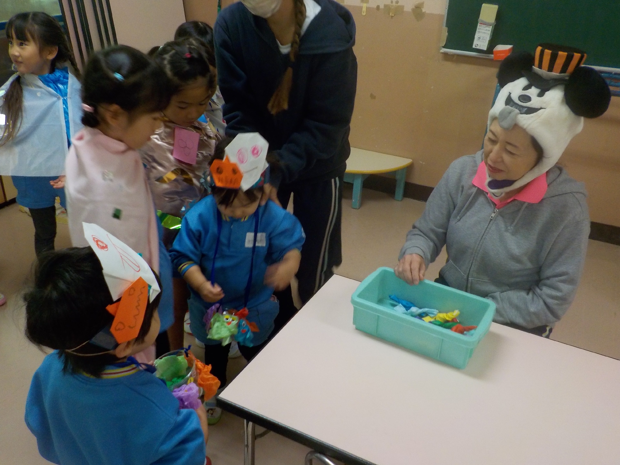 隠れている先生を見つけたら、トリックオアトリートと言って飴を貰いました。