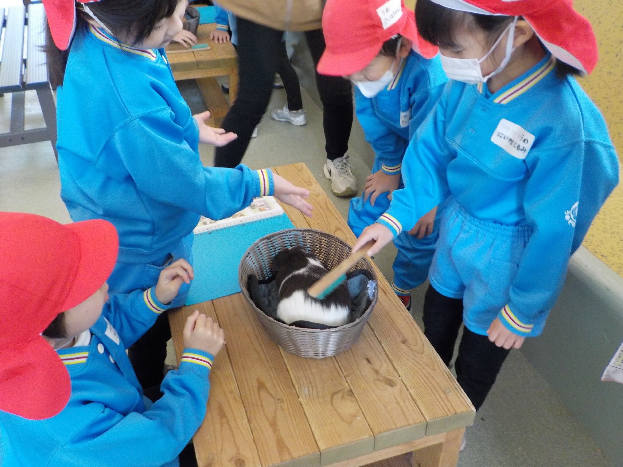 ふれあい広場で、モルモットにブラシをかけたり