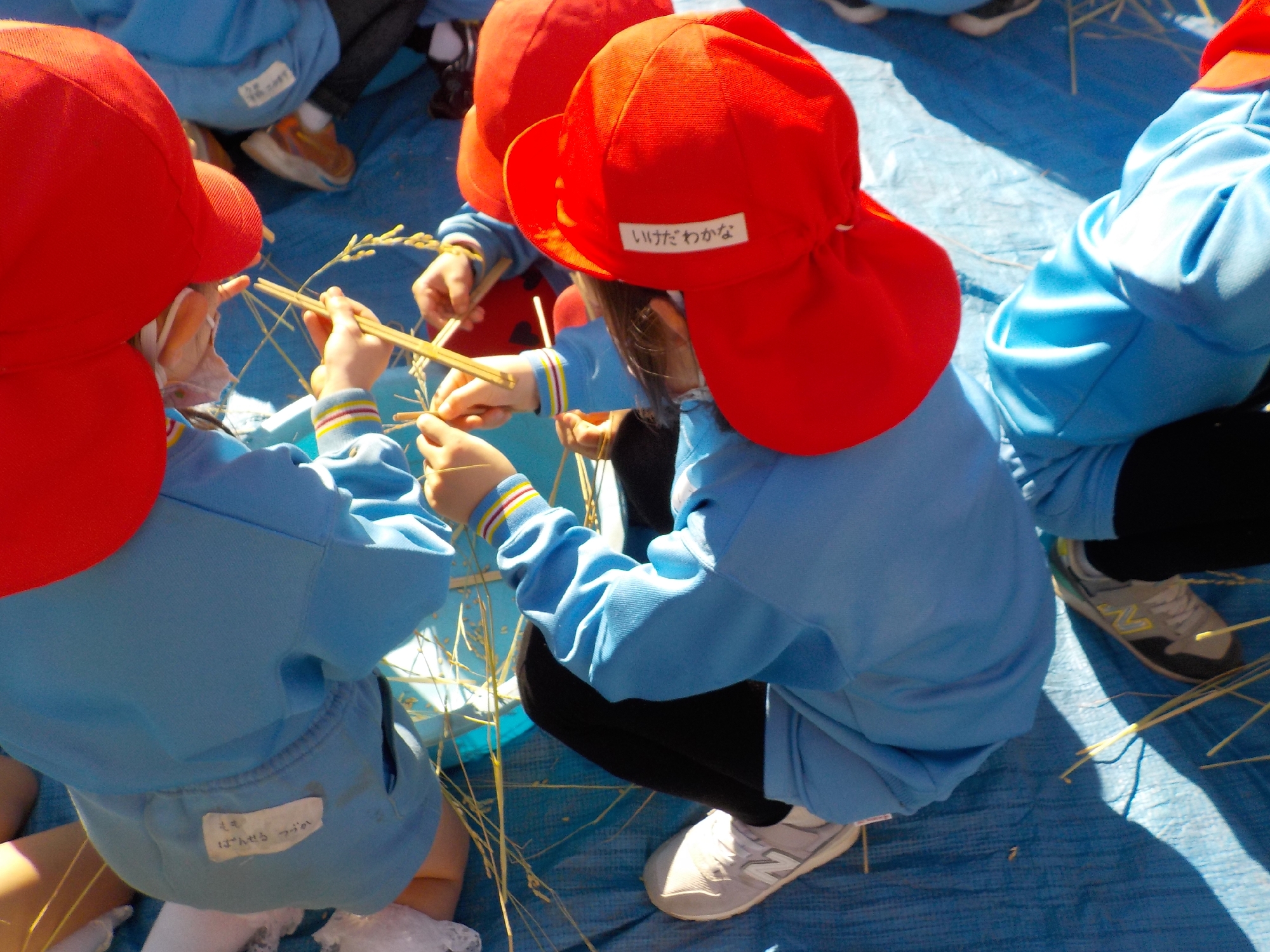 脱穀割り箸を使って稲穂から籾を1つ1つとる作業です。