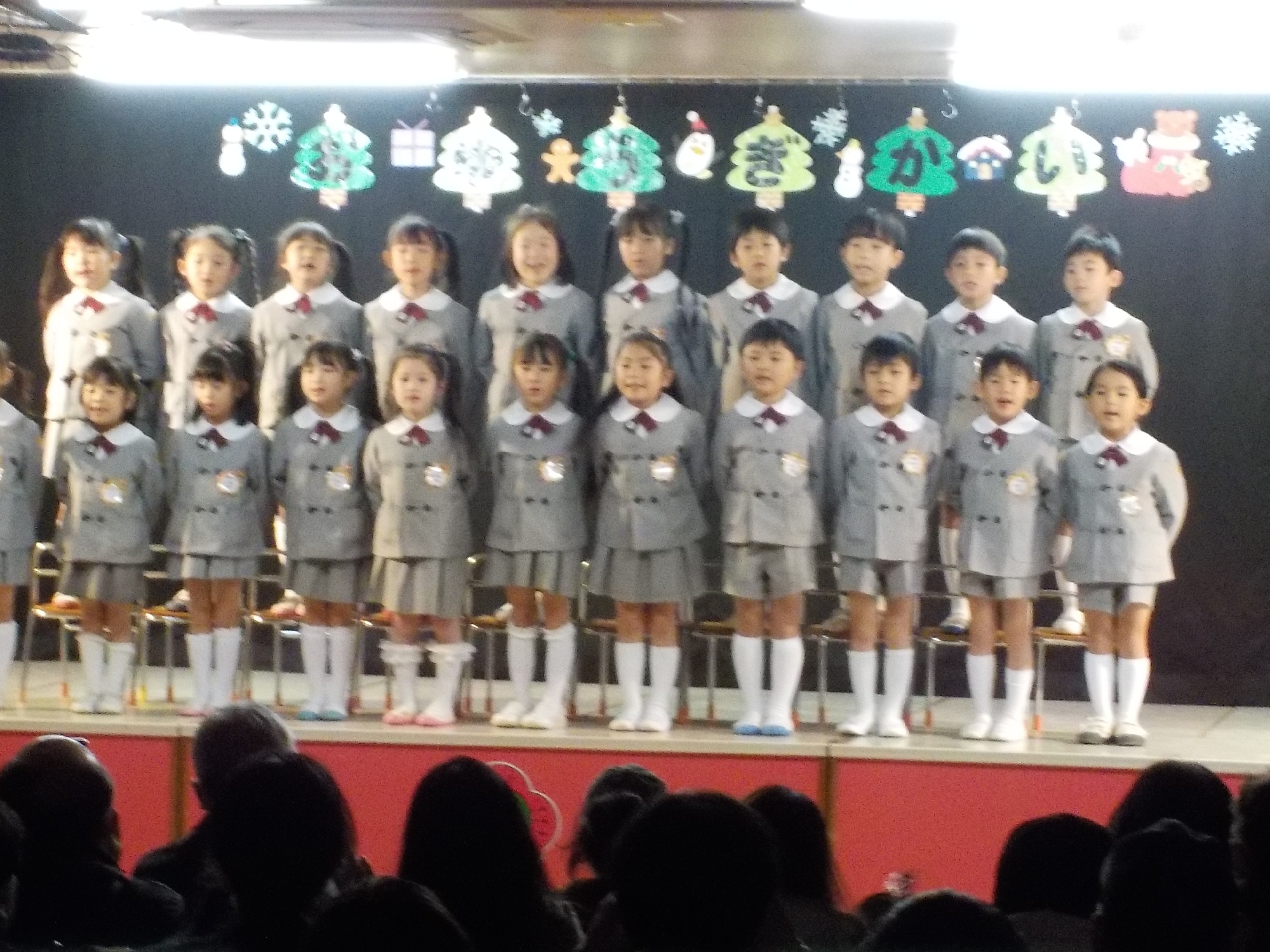 合唱は英語で「Jingle Bells」「We wish You a Merry Christmas」、日本語で「サンタクロースはどこだ」「あわてんぼうのサンタクロース」、アンコールでは「赤鼻のトナカイ」を歌いました