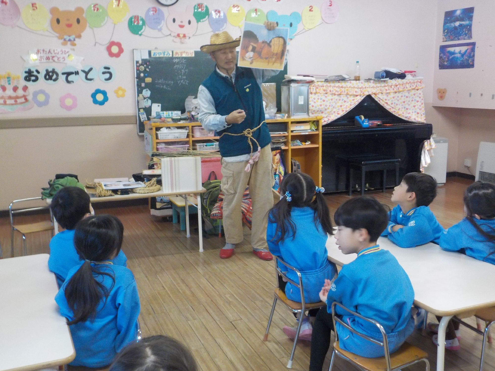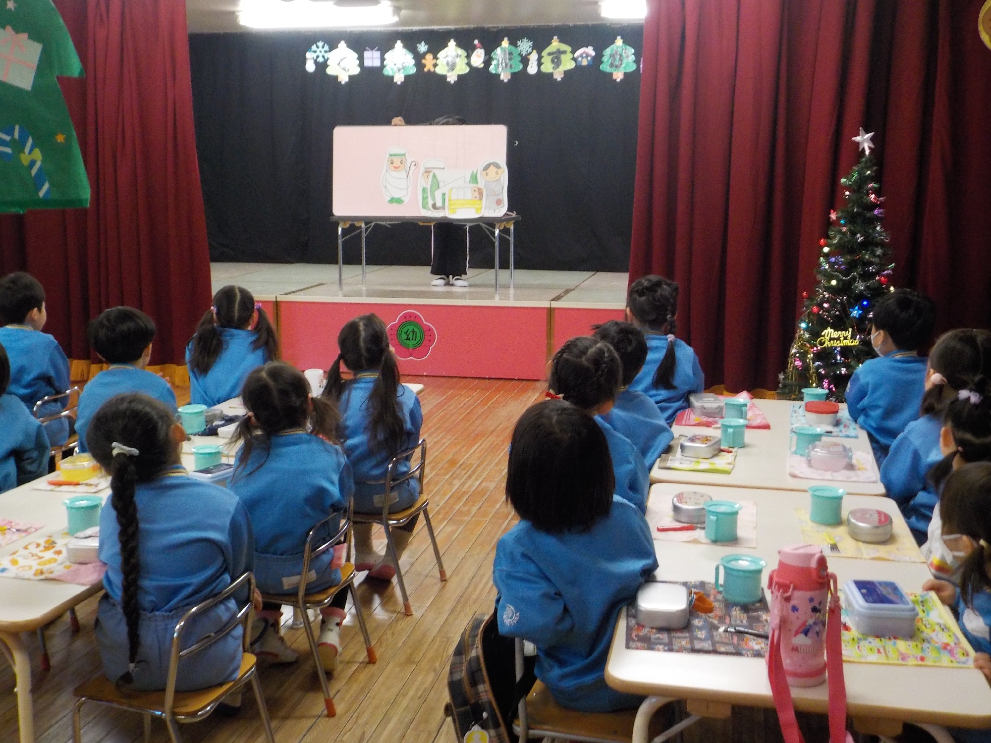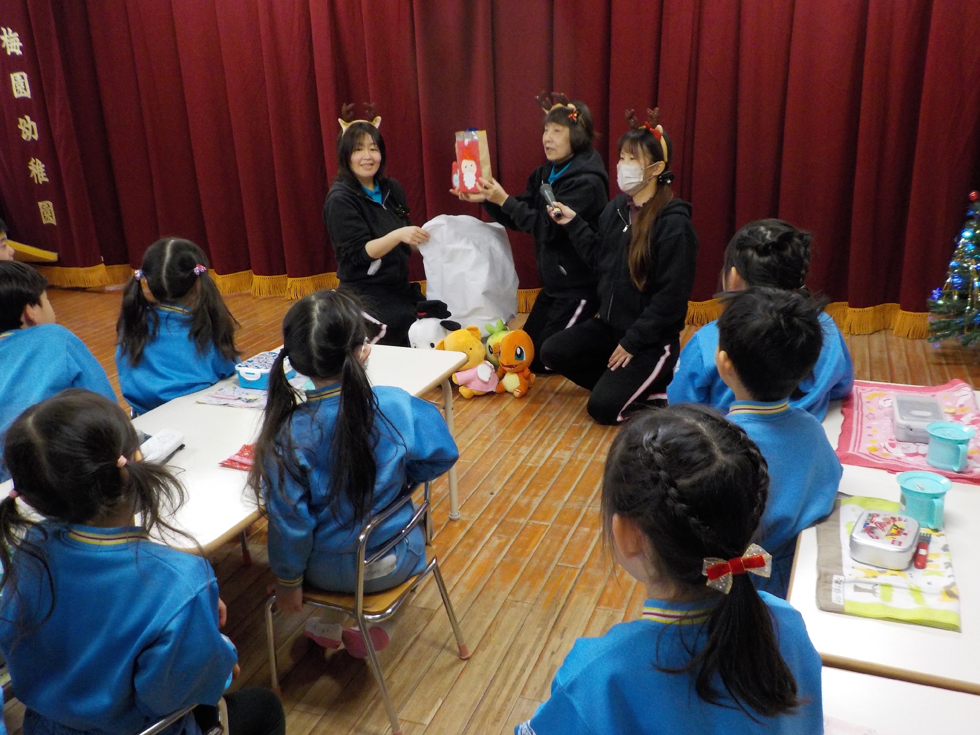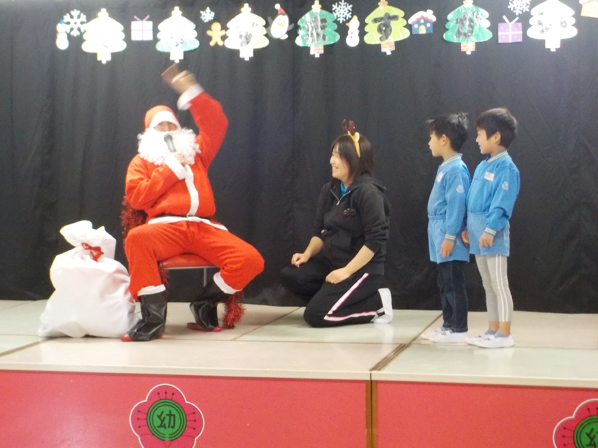 本物のサンタの登場にワクワク。英語で質問したり、お歌のプレゼントをしました。