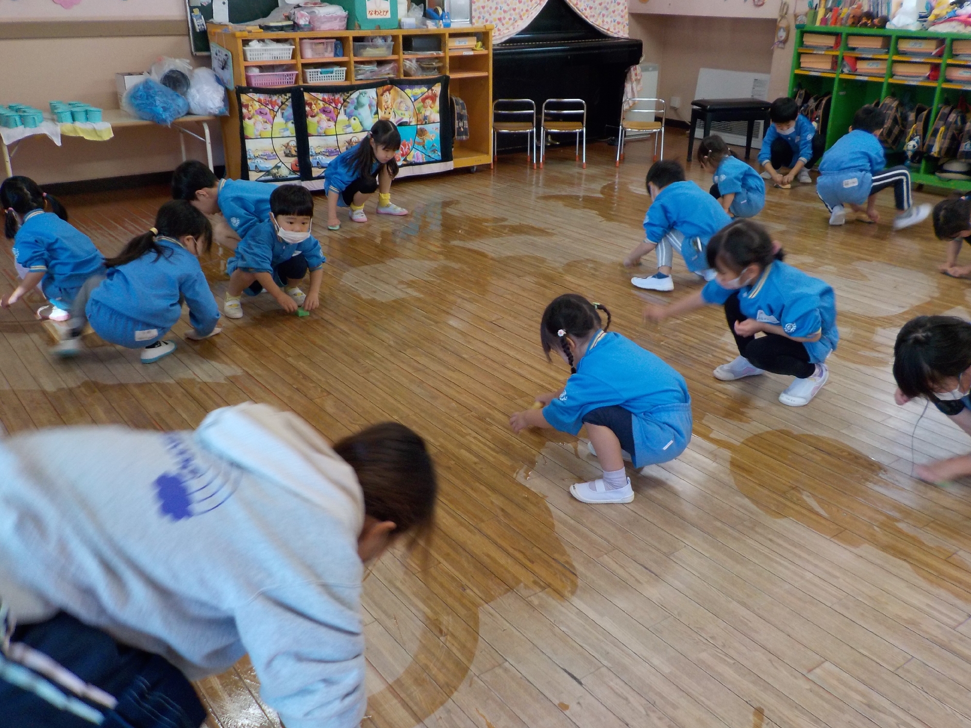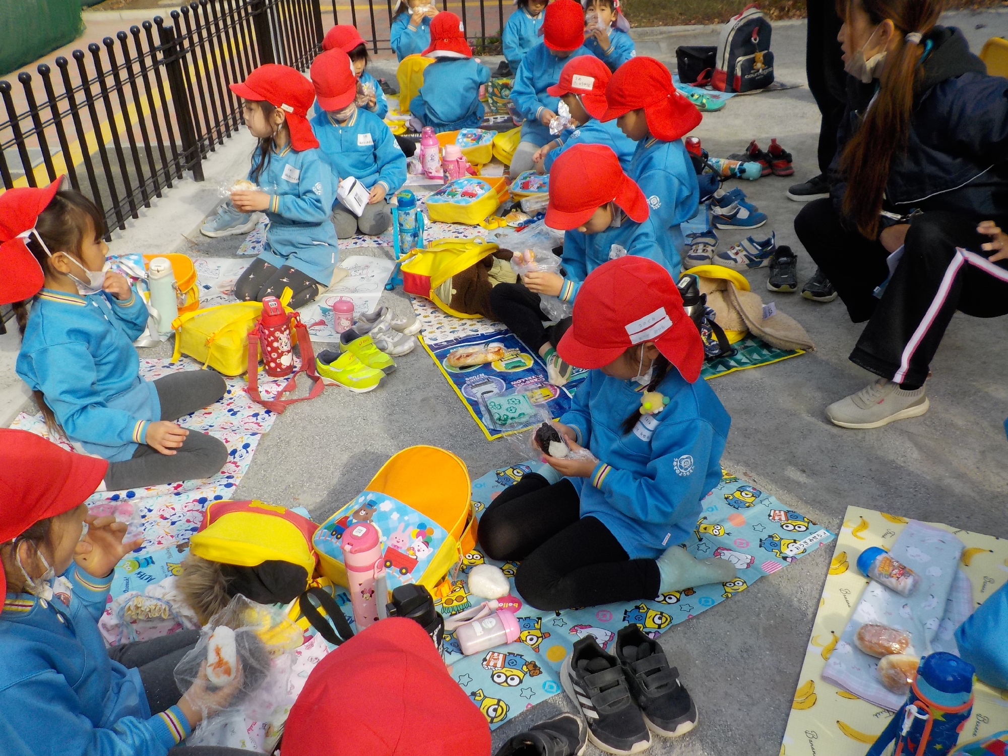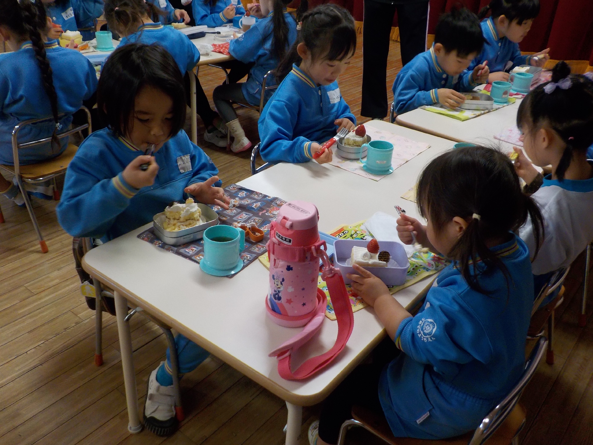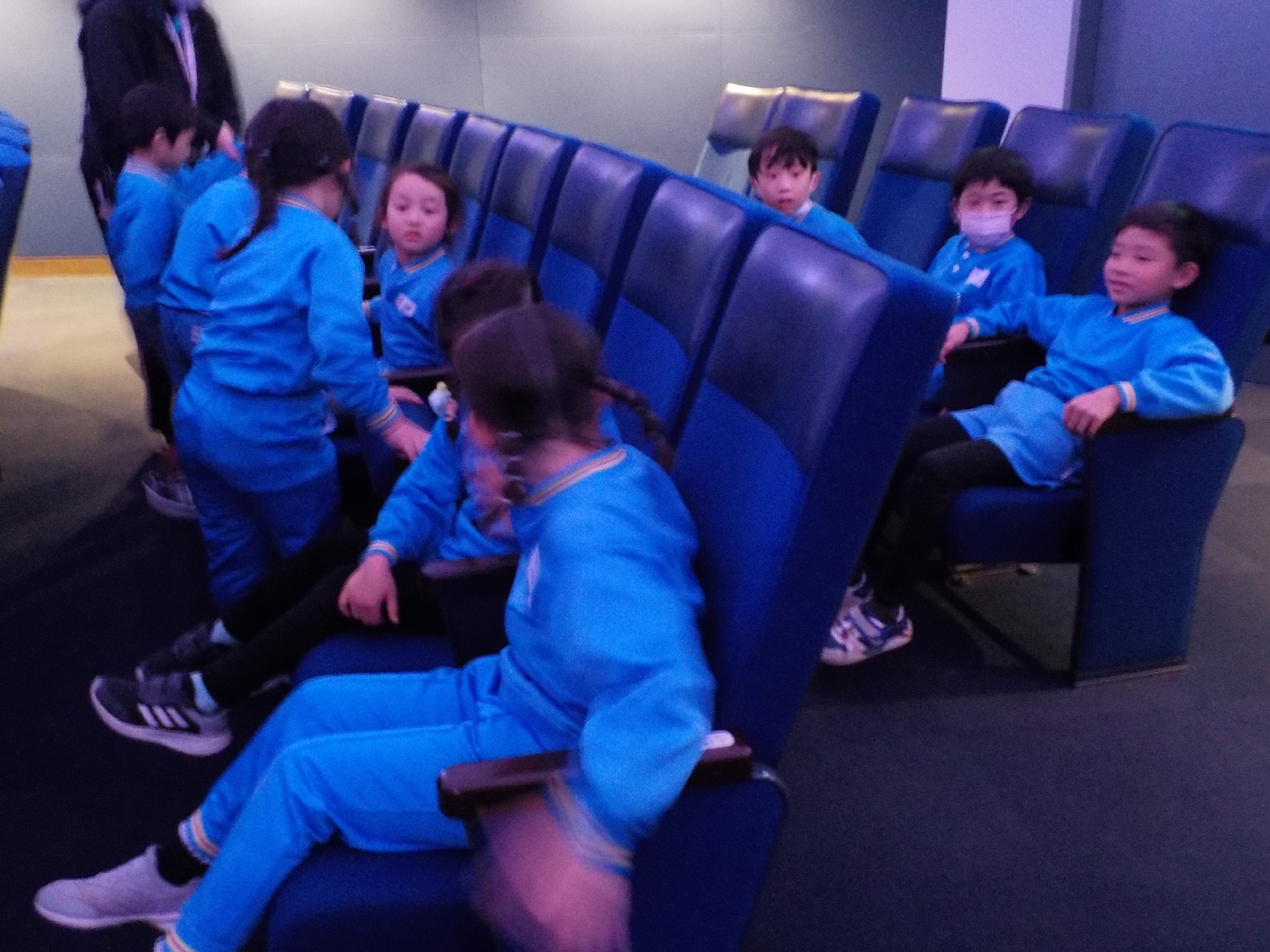 本物のサンタの登場にワクワク。英語で質問したり、お歌のプレゼントをしました。