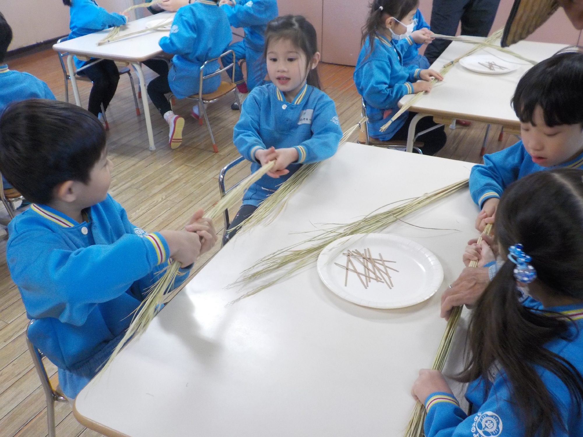 収穫した稲のワラを2人1組でねじって、ぐるりと回して